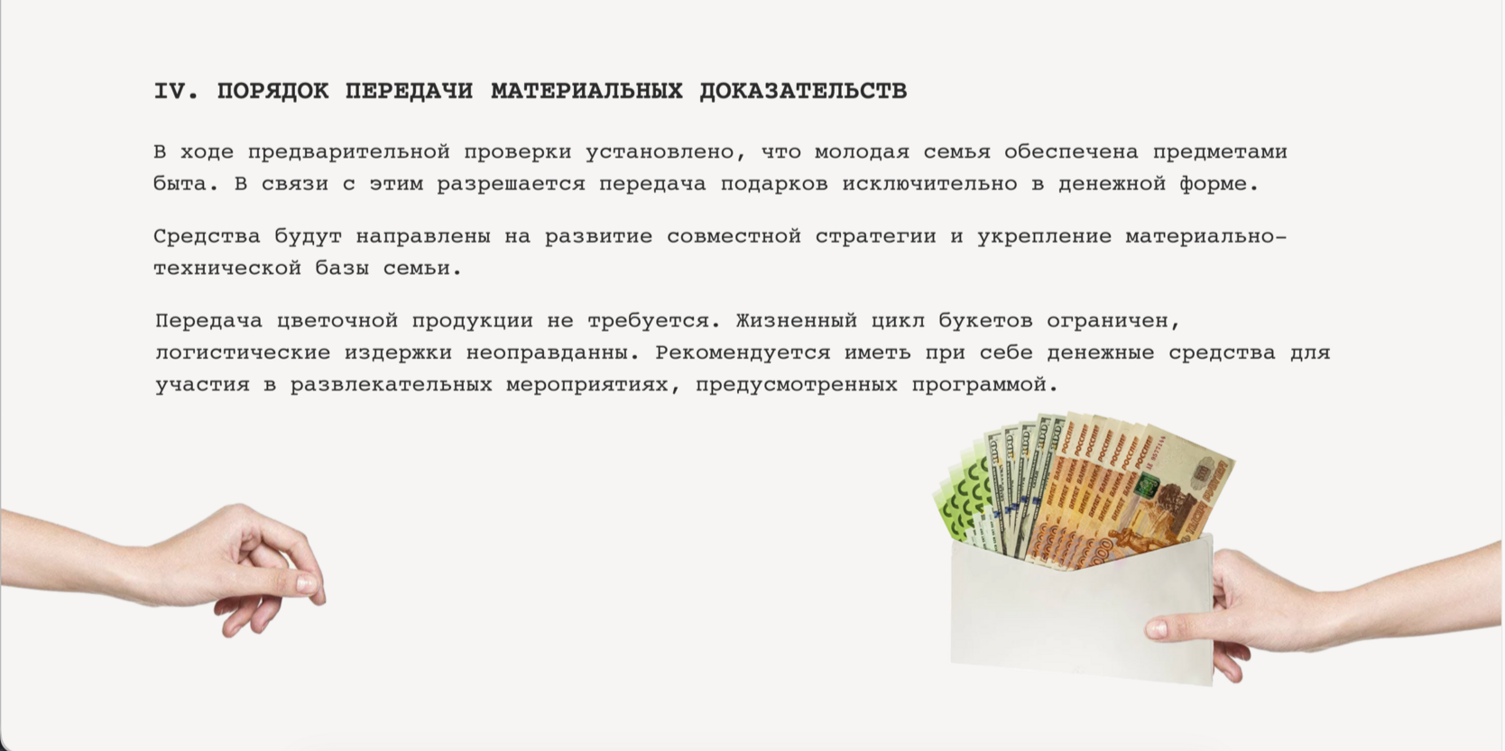 - Понятым рекомендуется прибыть вовремя, в установленном дресс-кодом виде и в полной готовности к активному участию в праздничных процессуальных действиях.