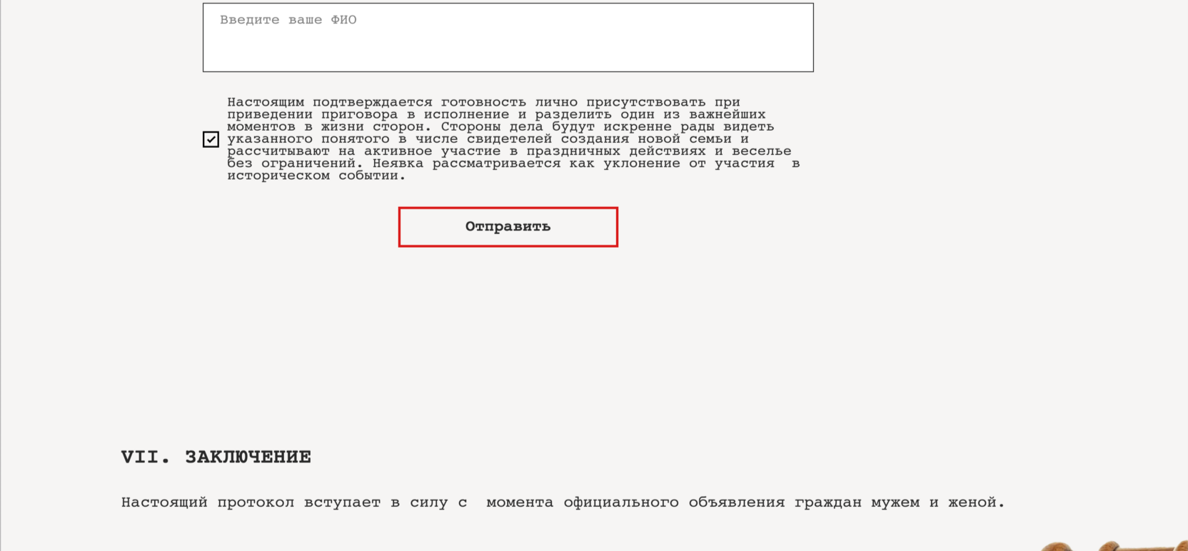 Настоящий протокол вступает в силу с момента официального объявления граждан мужем и женой.